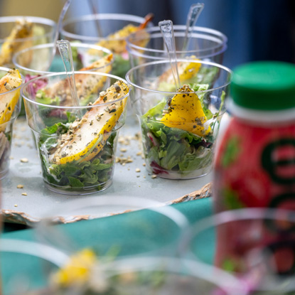 Voda se zagreje u šerpi do tačke pre ključanja i doda se malo sirćeta, potom se jaje razbije u manju posudu i pažljivo spusti u vodu stvaranjem blagog vrtloga, nakon čega se kuva 2–3 minuta dok belance potpuno ne obavije žumance, a zatim se pažljivo izvadi i ostavi da se ocedi. - Tzatziki sos: